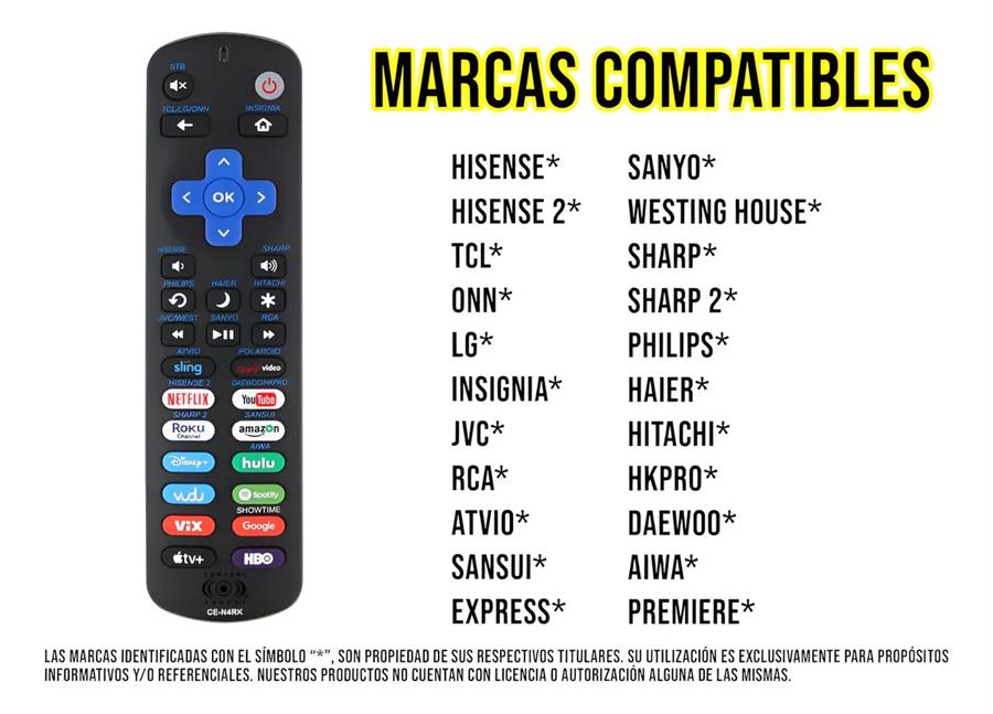 - Funciona con Smart TVs Roku integrados de diversas marcas como TCL, LG, ONN, Insignia, HISENSE, Sharp, Philips, Haier, Hitachi, JVC, Westinghouse, Sanyo, RCA, ATVIO, Polaroid y Daewoo.